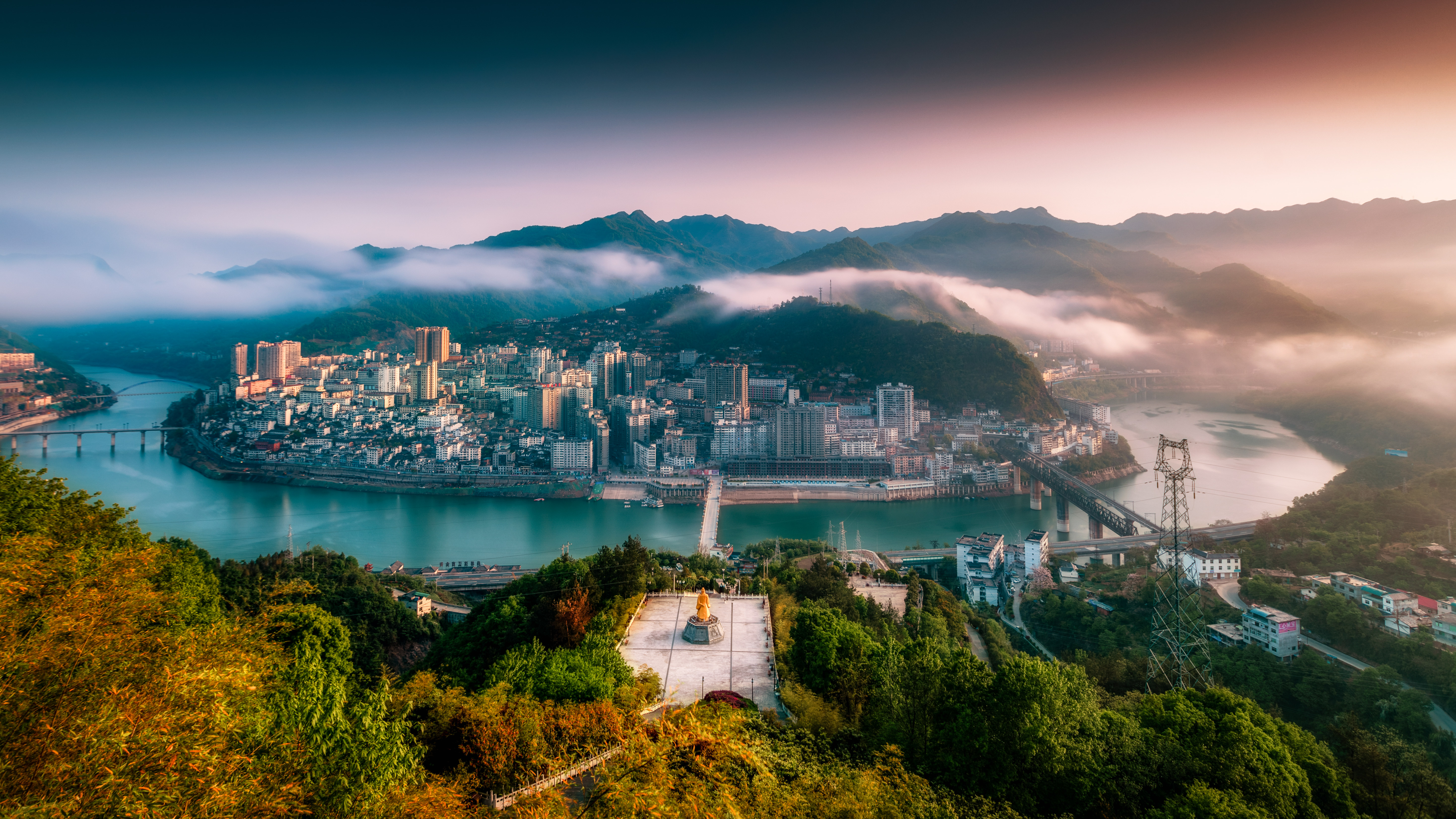 走进文笔山巅的紫阳阁,装修一新的紫阳“山水城市会客厅”光彩夺目。数字展厅的巨幅弧形屏上,滚动播放着紫阳四季流转的茶山云海。