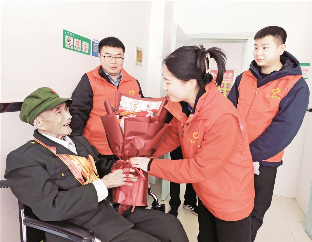 活动现场暖意融融,志愿者围在老人身边,促膝长谈、嘘寒问暖,细心询问其饮食起居和身体状况,认真倾听那段浴血奋战的革命故事。“老人饮食清淡,精神状态一直很好。”护理人员李娟介绍,老人性格开朗,时常给大家讲述战场事迹,传递着满满的正能量。