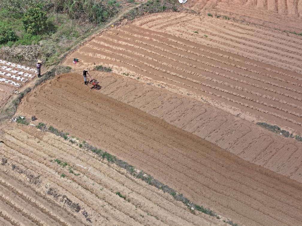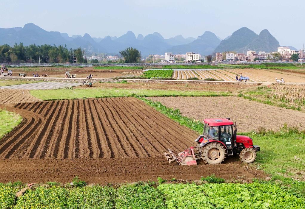 近日,广西来宾市忻城县城关镇都乐村农民驾驶农机在翻耕田地,准备种植玉米(无人机照片)。一年之计在于春,各地人们忙着翻耕土地、培育秧苗、检修农机、装运化肥,为春耕生产做准备。新华社发(樊绍光 摄)