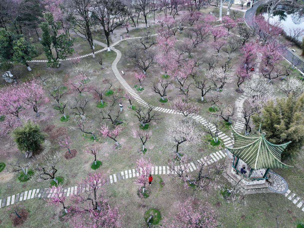 近日,游客在湖北省武汉市青山公园赏花游玩(无人机照片)。新华社发(赵军摄)
