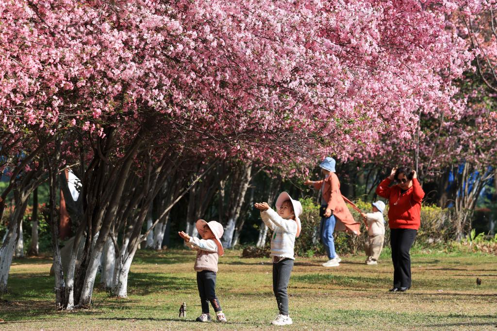 近日,游客在云南省曲靖市沾益区玉林广场海棠花树下赏景游玩。新华社发(孙文来摄)