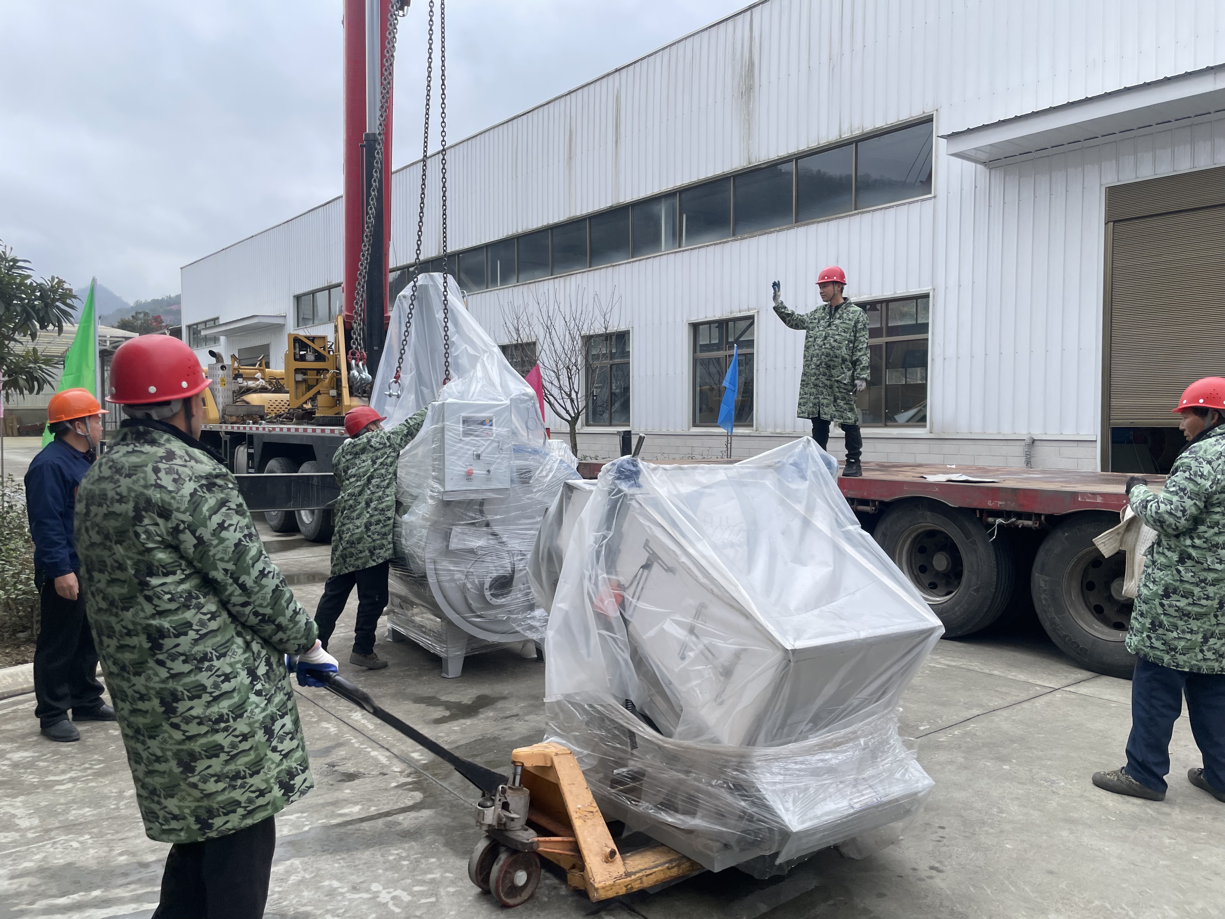 走进平利硒地抹茶茶业有限公司厂区,一派繁忙景象映入眼帘:满载设备的大型货车缓缓驶入,吊车挥臂起吊,工人们协同搬运,一件件精密设备被精准定位。从入场指引到吊装作业,再到设备摆放,各环节环环相扣、井然有序。