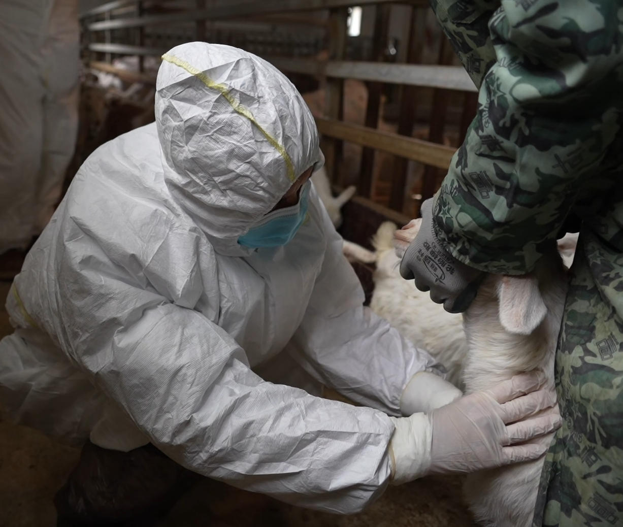 3月1日,在汉滨区关庙镇唐淌村甲升兴隆养殖合作社,畜牧兽医师王峰身着白色防护服,蹲在羊圈边,采集山羊血样,为春季动物防疫工作“精准把脉”。