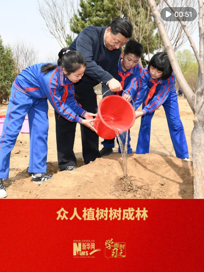 党的十八大以来,习近平总书记每年都会身体力行,参加首都义务植树活动。他强调,让我们从自己、从现在做起,把接力棒一棒一棒传下去。
