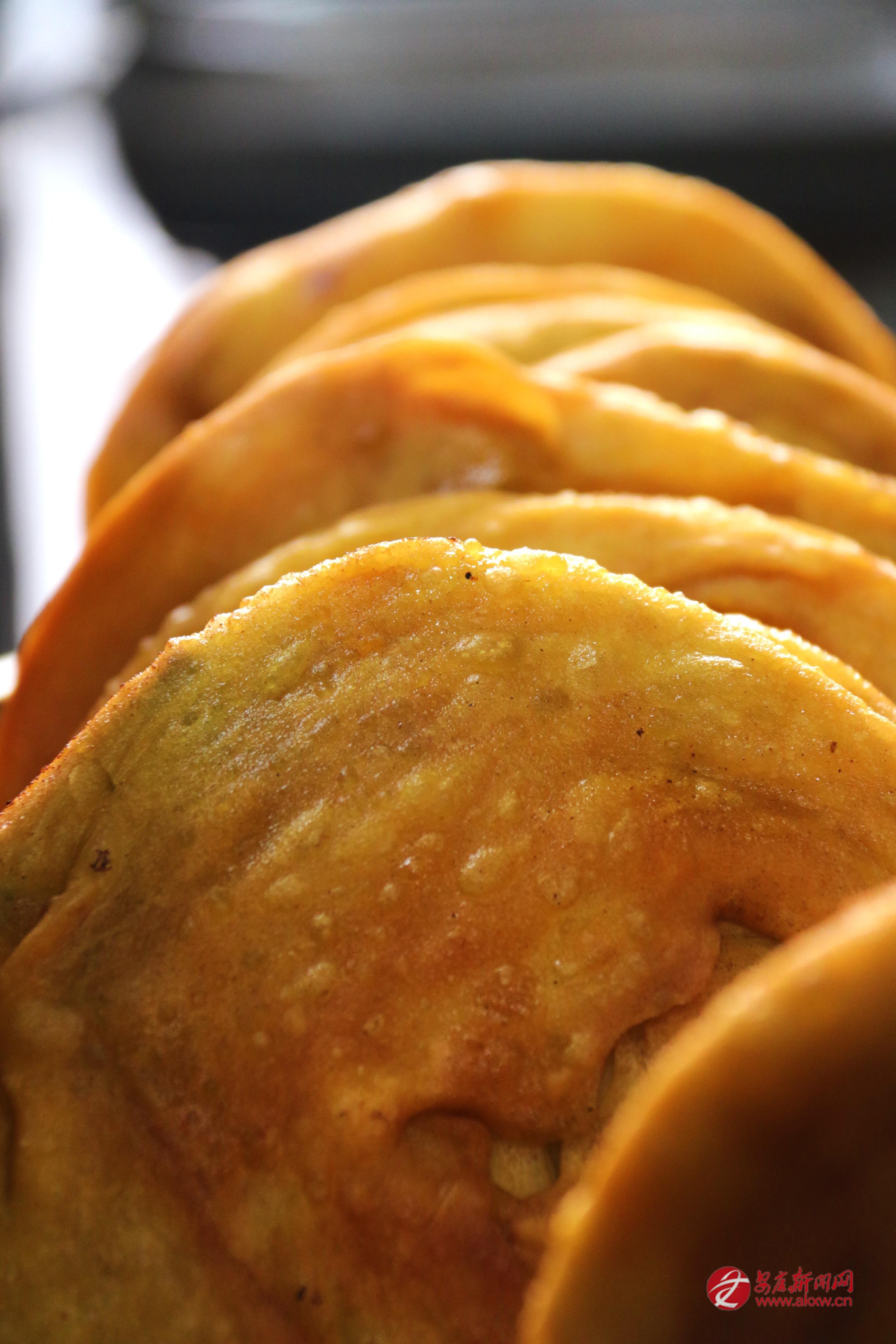 煎饼要用平底锅,油要多,最好能没过饼的一半。锅烧热了,放一点炼过的羊油,那油在锅底滋滋地化开,香气就起来了。饼放下去,小火慢煎,不住地翻面。眼看着,饼子慢慢鼓起来,皮儿渐渐金黄,有些地方焦黄了,有些地方还嫩着。起锅的时候,整个饼子金黄黄的,油光光的,拿在手里烫得很。