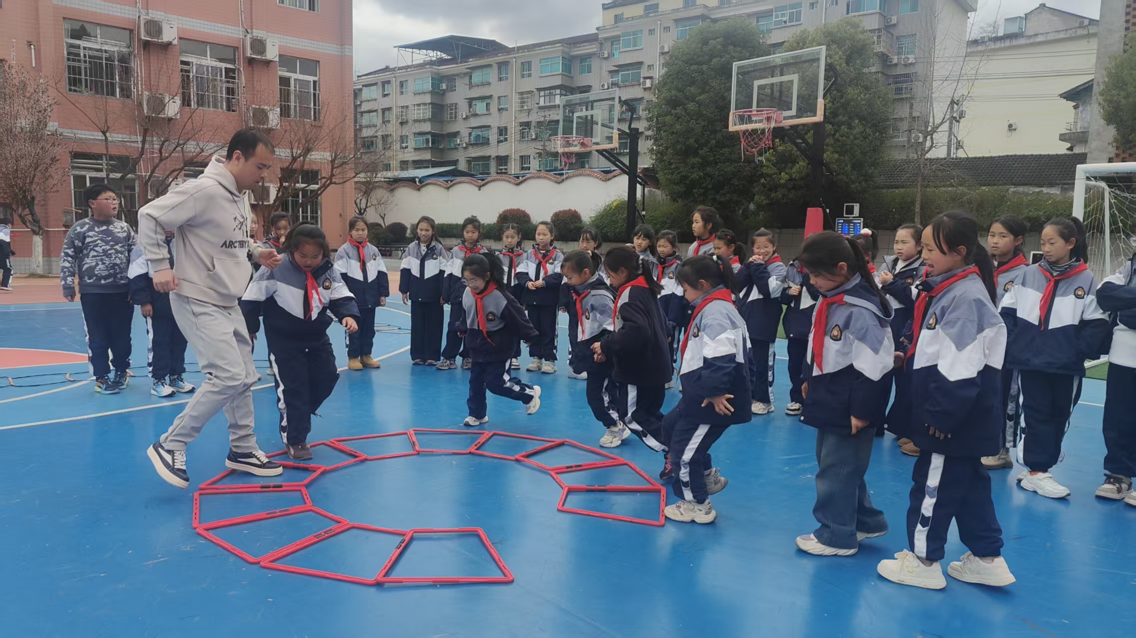 下课铃响后,孩子们没有留在教室,而是三五成群涌向操场边的“微运动角”。跳绳、沙包、皮筋、毽子等小器材随手可取,大家尽情玩耍,操场上满是欢笑声。面对校园空间局限,学校将校园内的“边角地块”改造为“微操场”,配置简易体育器材,让这些“方寸之地”成为学生课间活动的“金角银边”。为避免课间活动拥挤,各年级活动区域实行“错峰分流”使用,互不干扰、有序流动。