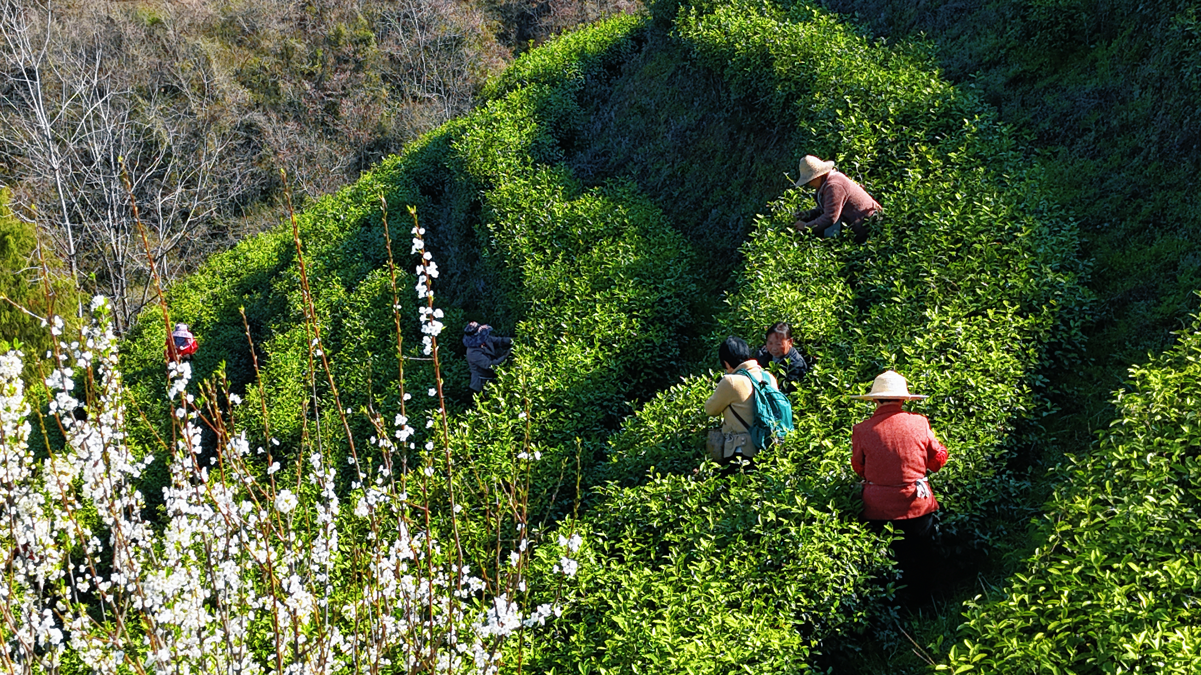 3月17日,在汉阴县漩涡镇发扬村茶园,茶农们腰挎竹篓,在茶垄间娴熟地采摘着今年的头茬春茶。该茶园总面积860亩,全年产值稳定在650万元左右。王建霞 摄