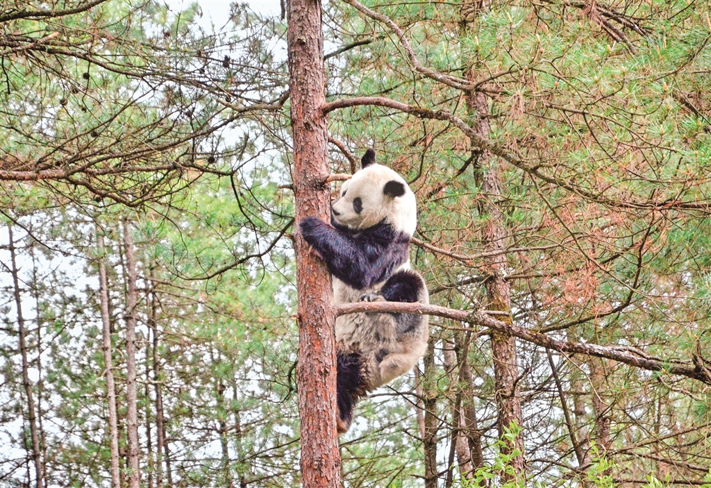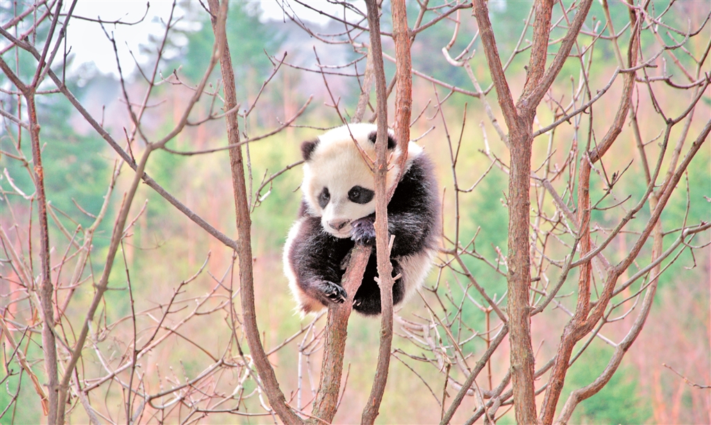在树上躲避天敌、等待母亲归来的大熊猫幼崽