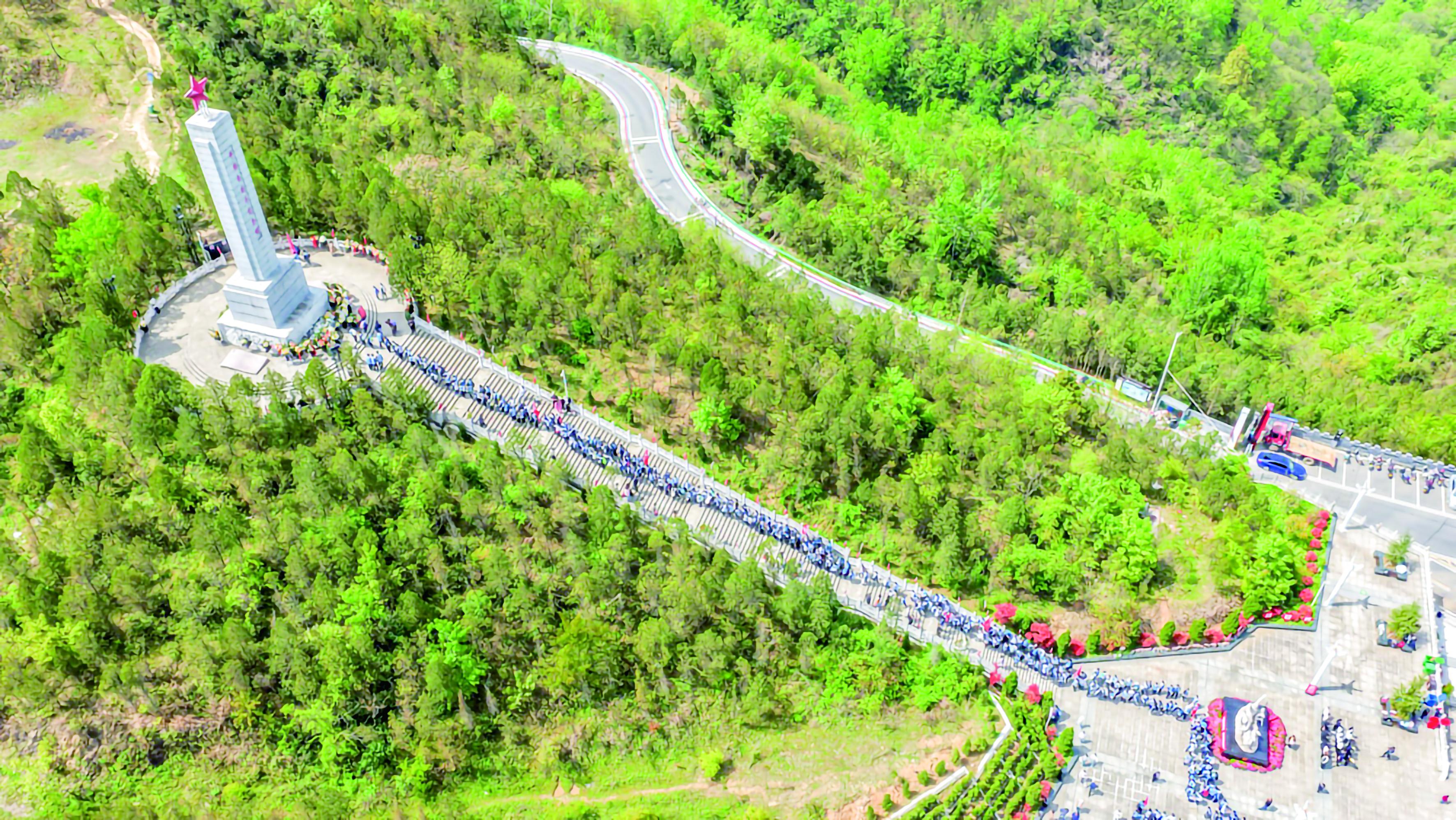 ▼ 4月3日,江北高级中学、安康中学初中部等5所学校的3000余名师生徒步赴牛蹄岭开展清明祭奠烈士活动。 皮勇维 摄