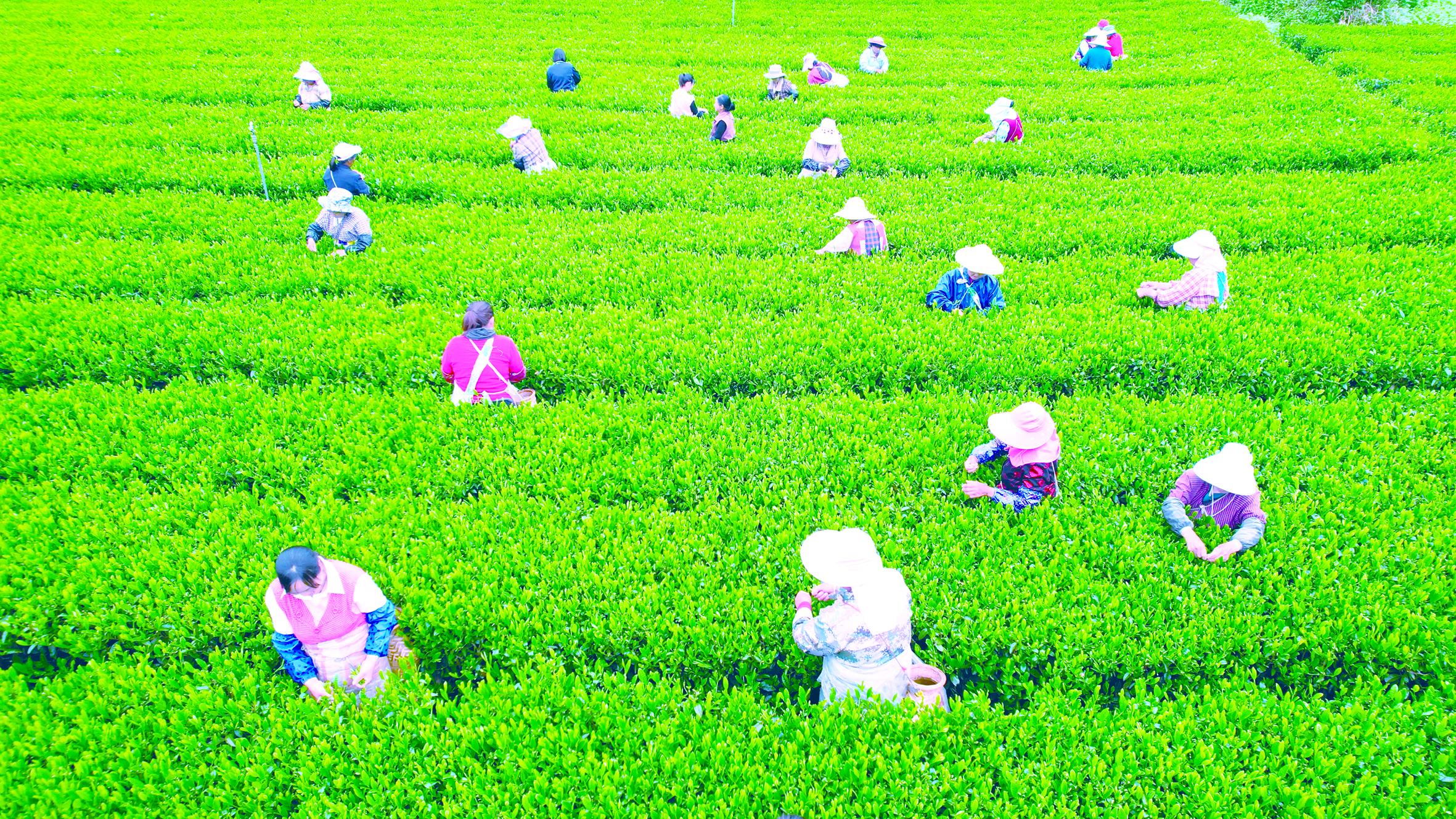近日,在紫阳县焕古镇春堰村茶园基地,茶农正在采摘春茶鲜叶。储茂银 摄
