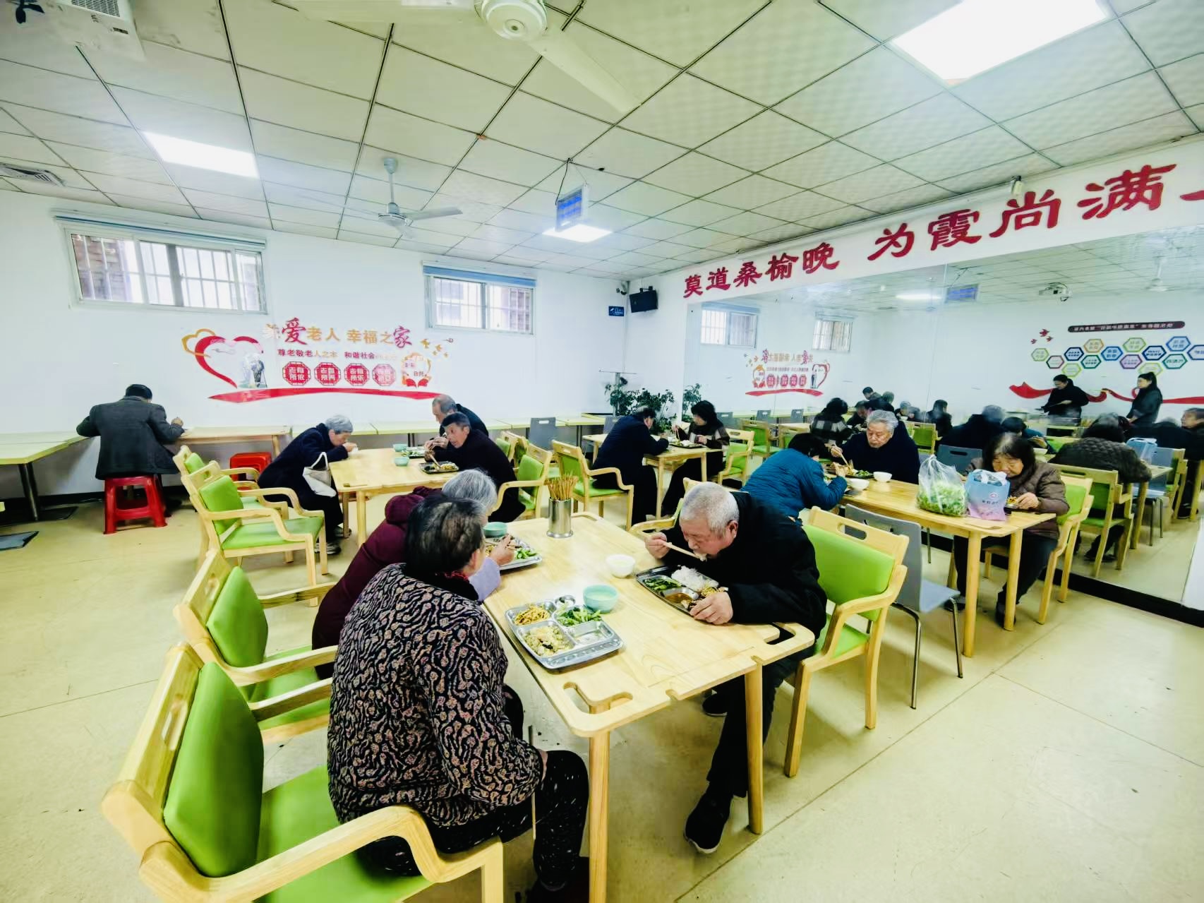 “开饭咯!”随着厨师一声洪亮的吆喝,社区里的老人不约而同地起身,迈着慢悠悠的步子走向餐厅。不一会儿,一道道家常菜肴就端上了桌:清炒油麦菜脆嫩爽口,酸辣土豆丝开胃解腻,猪肉炖粉条炖得软烂,老人不用费牙就能咬动,再配上一碗热气腾腾的排骨汤,三菜一汤,荤素搭配,既可口又有营养。