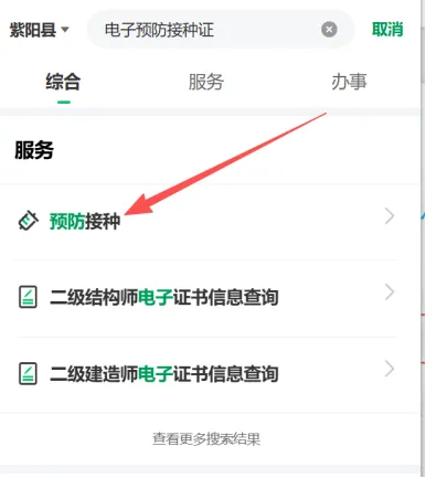 2.定位至常住县区,在查询栏点击,搜索电子预防接种证,点击服务栏的“预防接种”进入;