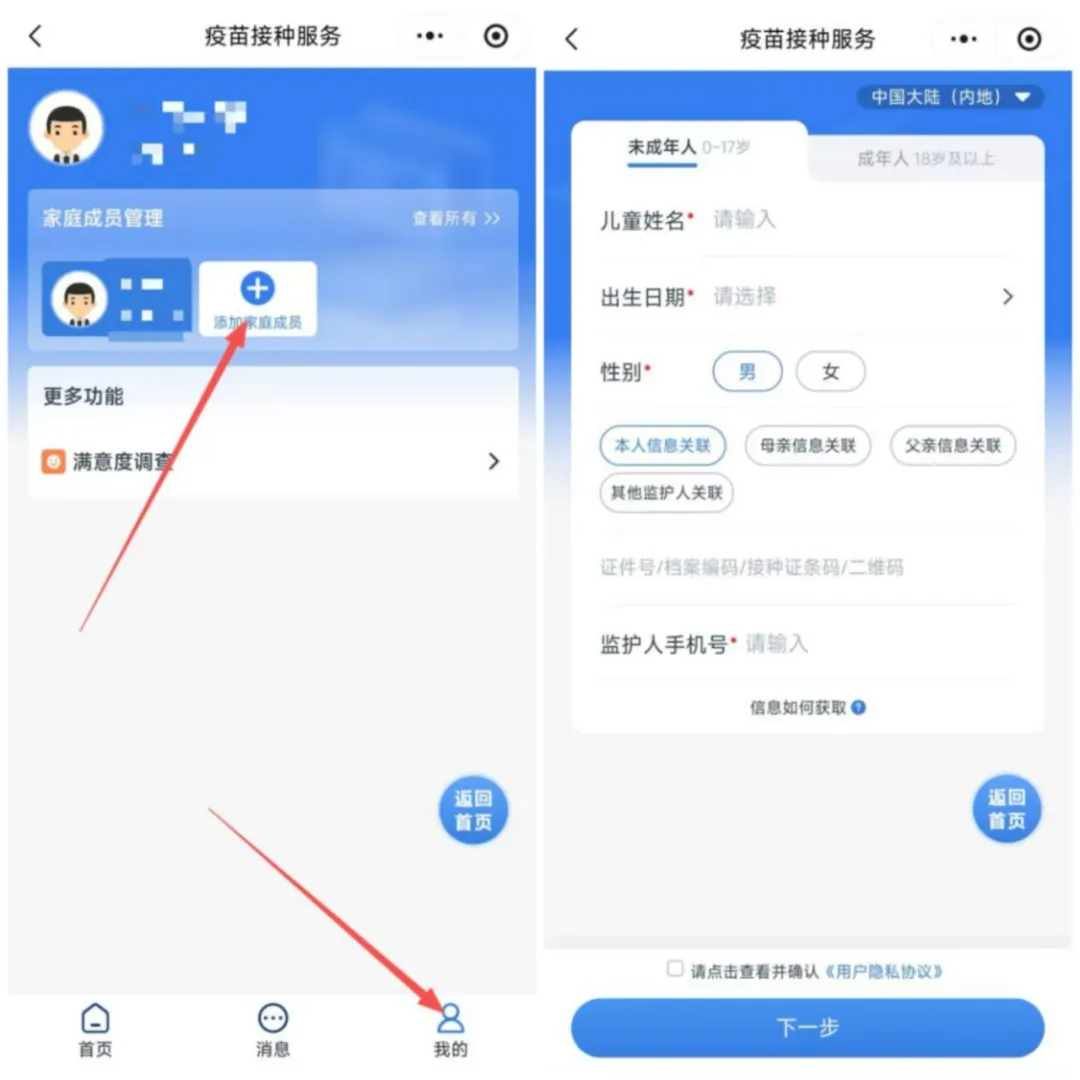 3.进入到疫苗接种服务界面,点击我的,在家庭成员管理里添加家庭成员,输入基本信息添加儿童;