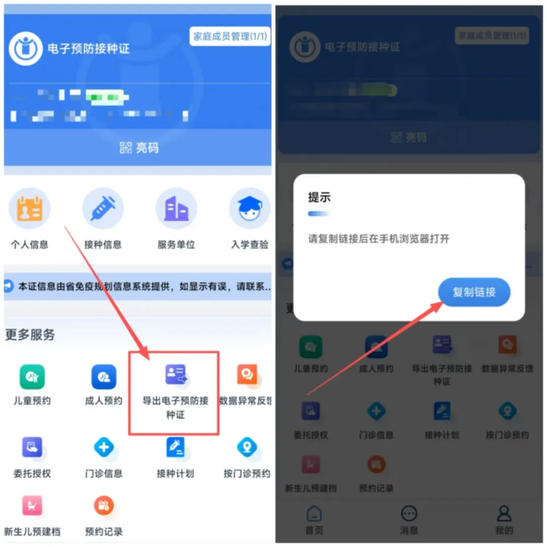 4.添加完成或已经添加过儿童的,点击导出电子预防接种证,点复制链接;