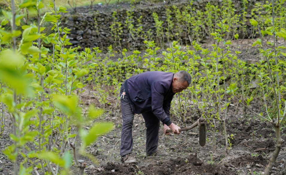 蚕农在桑园内精心管护桑树