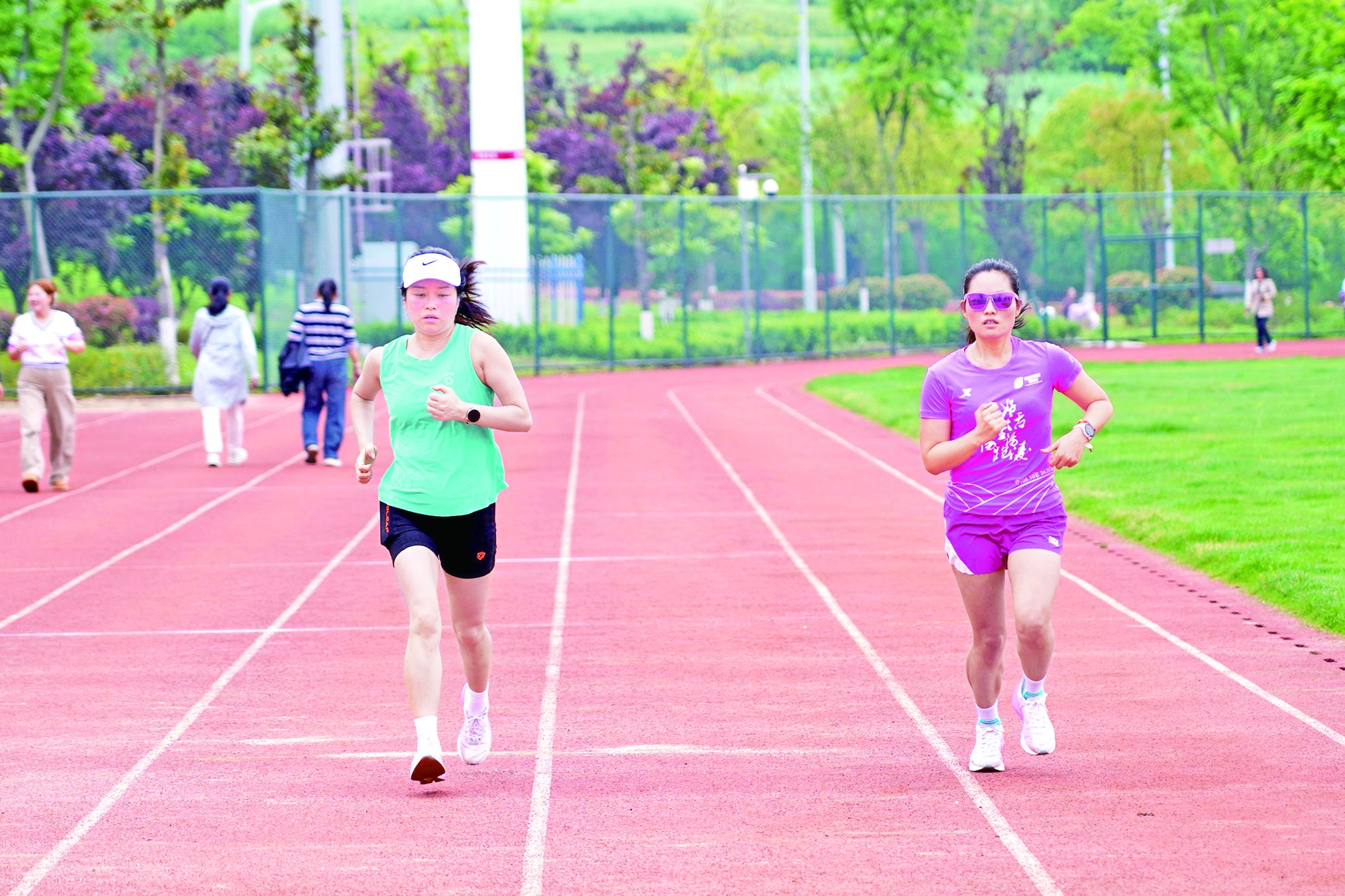 市民在市体育馆田径场跑步锻炼。 范旭 摄