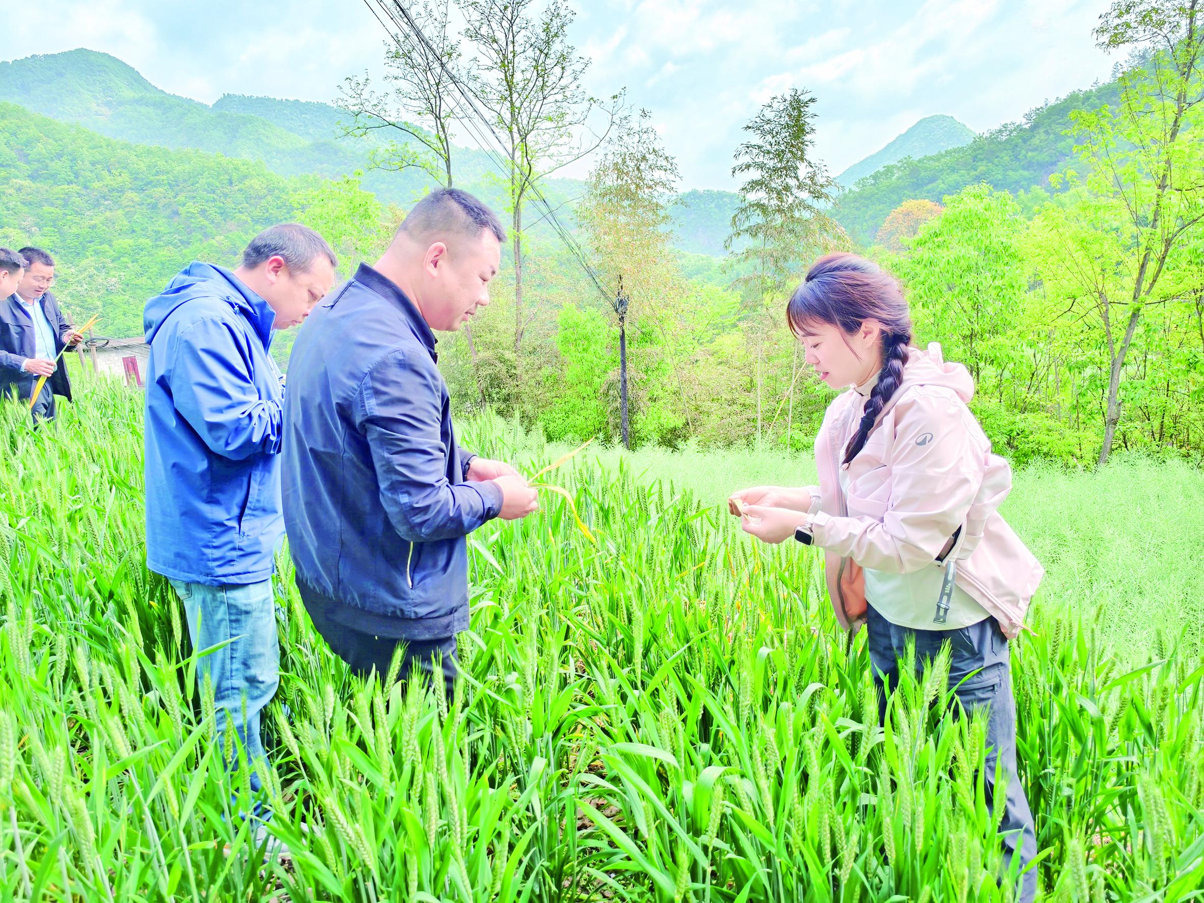 农机专家在麦地指导小麦病虫害防控工作。