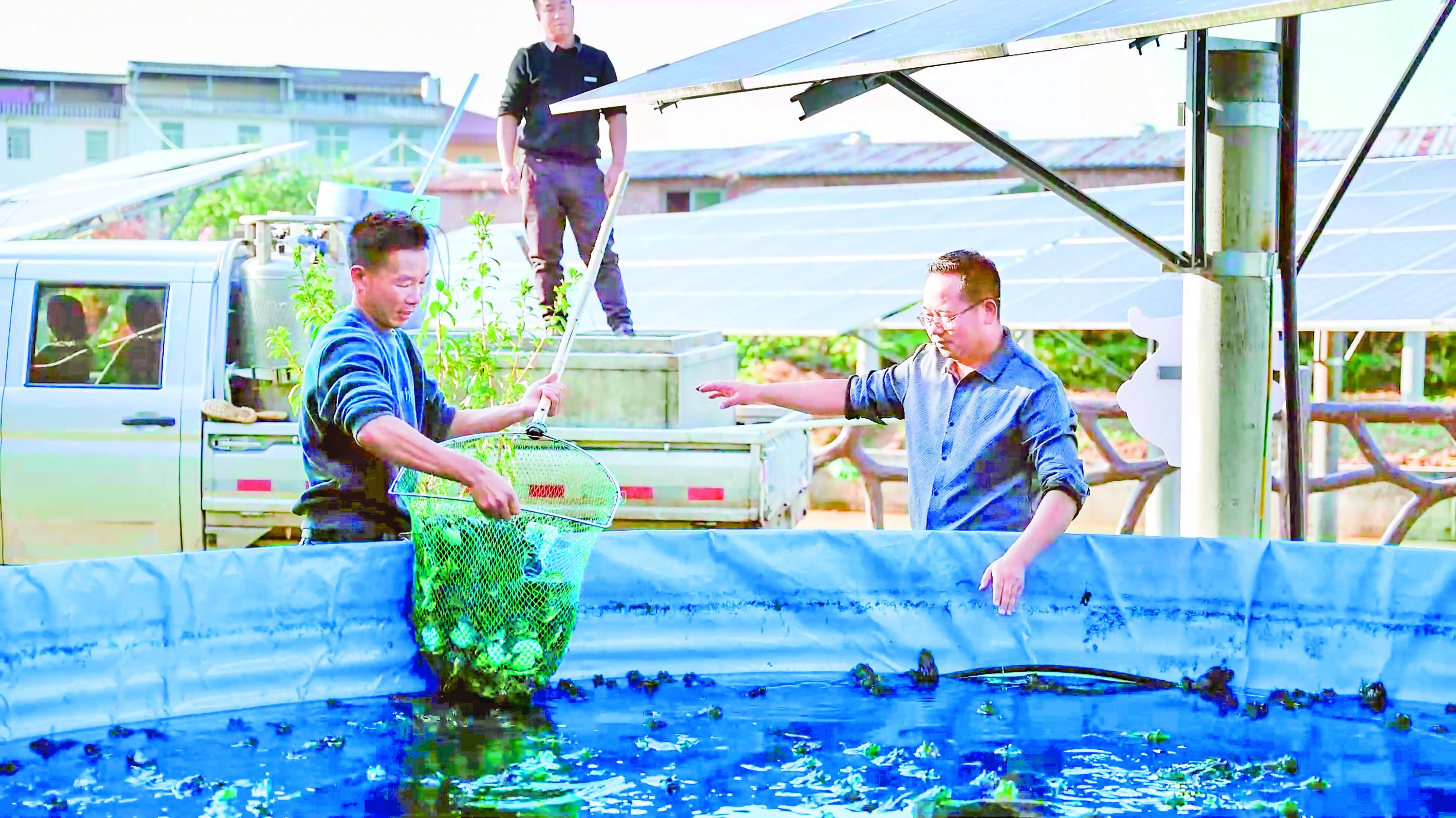 在高位陆基鱼池旁,陈小松(右一)和工人正在忙着捞鱼。 王建霞 摄