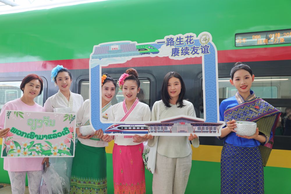 2025年7月18日,在昆明站,乘坐昆明至万象D86次列车的乘客与乘务员合影。新华社发(杨紫轩摄)