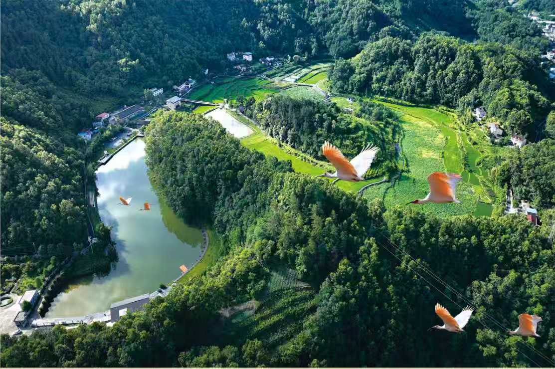 田野间,国家一级保护动物朱鹮悠然栖息——或低头觅食,或振翅掠过水面,与村庄、稻田构成一幅和谐共生的画面。