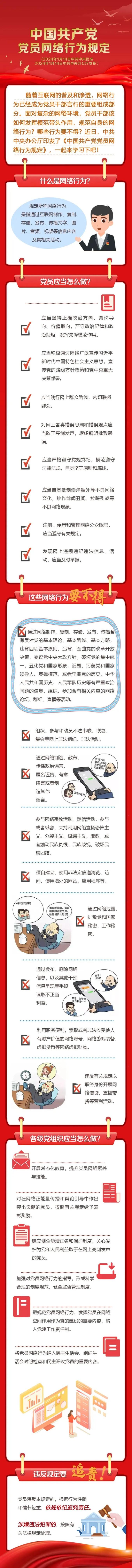 《中国共产党党员网络行为规定》于2024年1月14日经党中央批准、办公厅发布后同日施行,它是第一部规范党员网络行为的党内法规,是全体党员使用网络的根本遵循,共计5章31条。